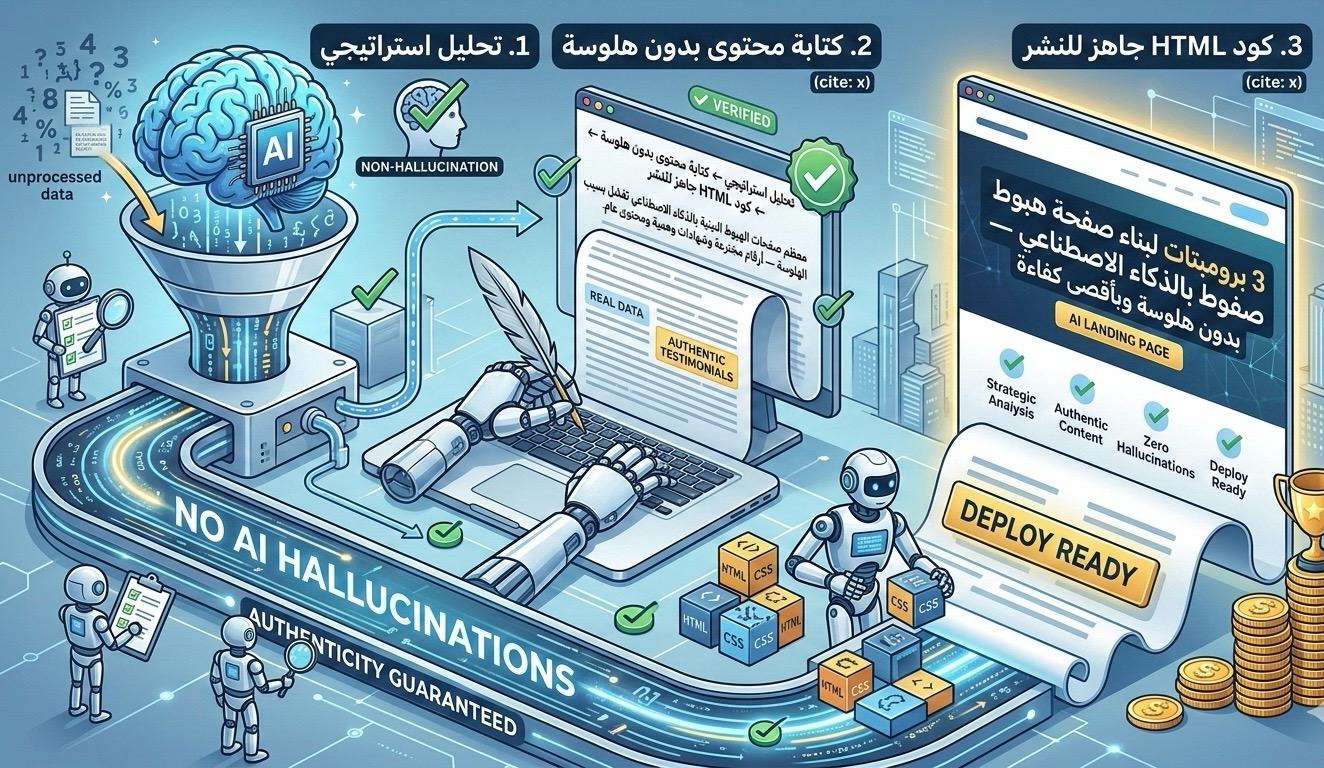 الحل ليس تجنب AI، بل استخدامه بطريقة استراتيجية. صممنا 3 برومبتات تعمل كسلسلة إنتاج (pipeline): كل خطوة تغذي التالية، وكل برومبت مصمم ليمنع الهلوسة بآليات محددة. النتيجة: صفحة هبوط مبنية على بحث حقيقي، محتوى يتكلم بلغة عميلك، وكود جاهز للنشر.