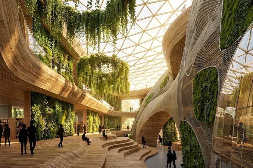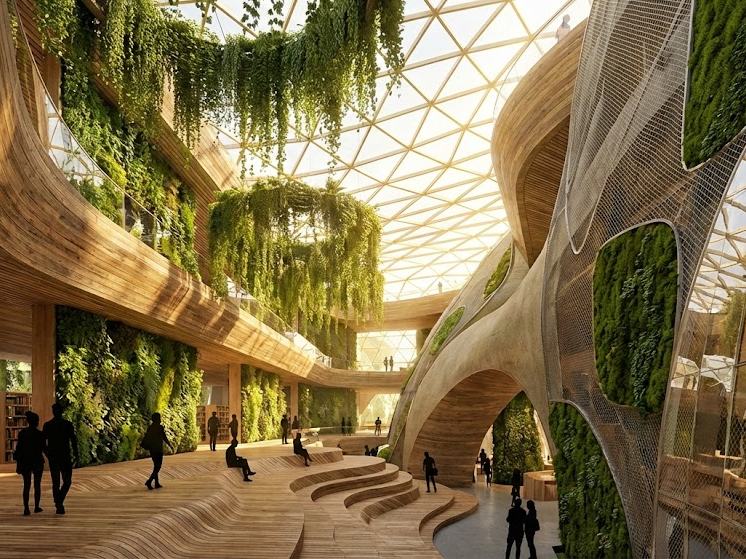 Reimagine any existing space or create a futuristic architectural concept that pushes boundaries — the kind of visionary design that appears in TED talks and architecture biennales. Visionary futuristic [SPACE TYPE: city library / community center / sustainable eco-home / airport terminal / urban vertical garden tower] architectural concept design. Design philosophy: biophilic futurism — where advanced technology and living nature merge seamlessly. Structural elements: organic curved forms inspired by natural structures (coral, bone, mycelium), no hard right angles. Facade: living moss and vertical garden panels integrated into parametric steel mesh structure, solar glass panels. Interior: soaring atrium flooded with natural light through a geometric glass roof, massive living walls floor to ceiling, canopy of hanging plants from ceiling, built-in timber seating platforms at multiple levels. Materials: recycled reclaimed wood, hempcrete, transparent solar glass, mycelium composite panels. Atmosphere: lush, breathing, alive — feels like being inside a forest inside a building. People silhouettes for scale showing the enormous scale. Golden natural light. Photorealistic architectural CGI, 8K, Pritzker Prize level design quality, Bjarke Ingels BIG studio aesthetic. Negative prompts: generic box building, no greenery, harsh corporate interior, dated materials, low quality. Replace [SPACE TYPE] with your desired building program. Add sustainability goals or specific biophilic elements you want featured.