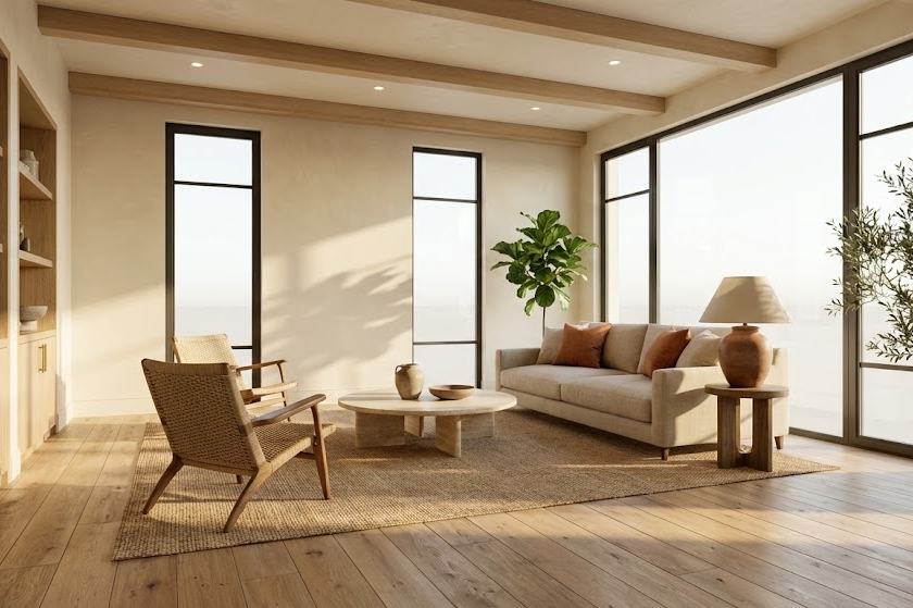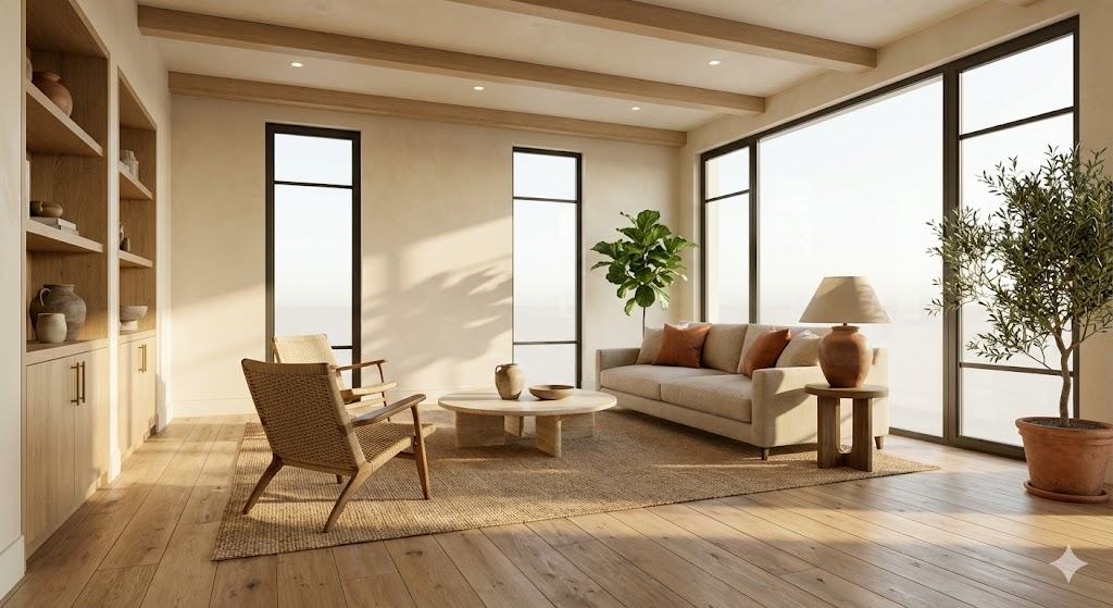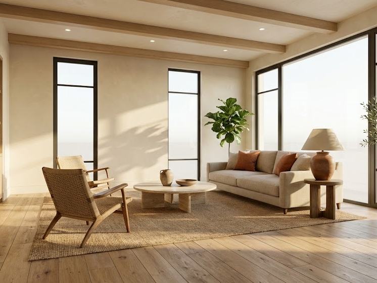 Transform any room description or reference photo into a stunning interior design visualization with a specific architectural style. [ROOM TYPE] interior design visualization in [STYLE: Japandi / Wabi-Sabi / Scandinavian / Bauhaus / Art Deco — choose one]. Architectural photography quality, shot with a wide-angle 24mm tilt-shift lens. Natural soft light flooding through large floor-to-ceiling windows, casting long afternoon shadows across the floor. Perfectly curated furniture arrangement with intentional negative space. Materials: [style-specific: natural oak wood, raw linen, matte plaster walls, handmade ceramic vessels, woven rattan, aged brass hardware]. Neutral sophisticated color palette with one warm accent. Indoor plants integrated naturally. Textures visible: grain of wood, weave of fabric, plaster imperfections. Architectural details: exposed ceiling beams or clean geometric lines. Real estate photography composition — corner shot showing two walls, full ceiling to floor. Photorealistic render quality, 8K, architectural digest style, no people. Warm golden hour ambient light supplement with recessed lighting glow. Negative prompts: cartoon, over-decorated, cluttered, CGI look, flat lighting, generic furniture, plastic textures. Replace [ROOM TYPE] with: living room, bedroom, kitchen, bathroom, home office, dining room. Replace [STYLE] with your preferred design style.