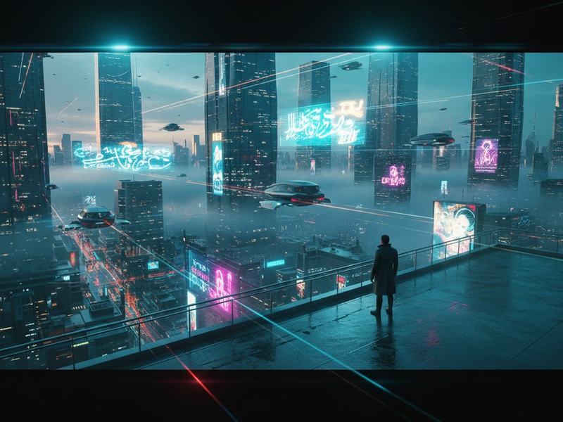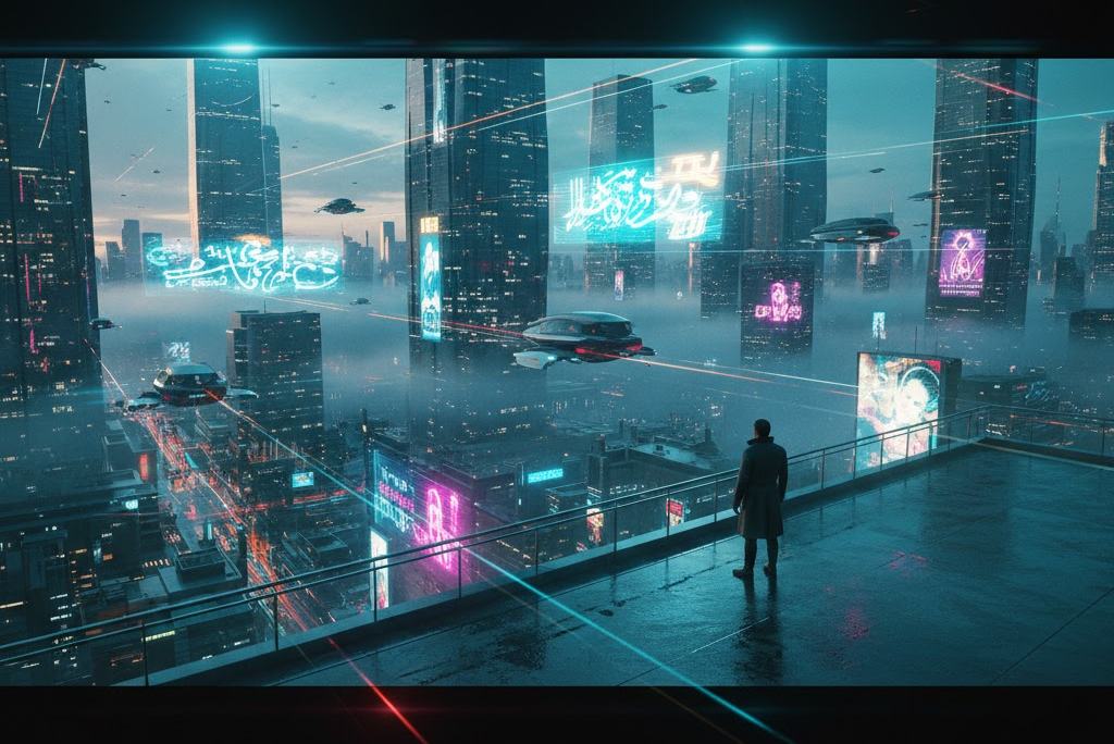 A breathtaking cinematic aerial view of a near-future megacity at blue hour, dense layers of volumetric fog weaving between towering glass skyscrapers, holographic neon advertisements in Arabic and English floating mid-air, autonomous flying vehicles leaving light trails, rain-slicked streets reflecting cyan and magenta neon below, a lone figure in a smart trench coat standing on a rooftop observation deck overlooking the sprawling city, shallow depth of field, anamorphic lens flare, shot on RED Monstro 8K VV, color graded in a cool teal-and-orange palette, cinematic widescreen